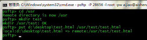 psftp> put d:\desktop\test.html /usr/test/test.html