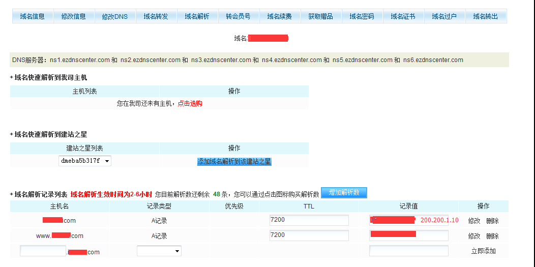 一个不好的消息,大部分域名是需要收费的,当然也有一些免费的比如 www.dot.tk,基本差不多,这里用我自己的一个域名来举例(如果不知道怎么搞到域名,baidu吧,收费的东西,在没给钱的时候,你总是可以找客服提很多问题^^,比如挖掘机什么的) 好吧,不管你在什么网上搞到了域名,找到域名解析设置,添加A记录,指向200.200.1.10